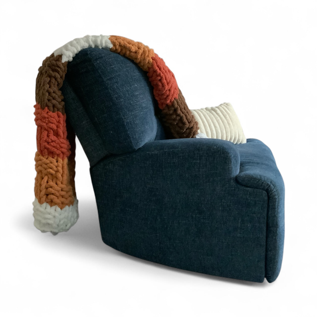 Bring the warmth of fall indoors with this hand-knit chunky blanket, crafted in cozy autumn tones of white, burnt orange, and chocolate brown. Made with luxuriously soft chenille yarn, this blanket is both stylish and irresistibly snuggly — perfect for adding seasonal charm to your living space.