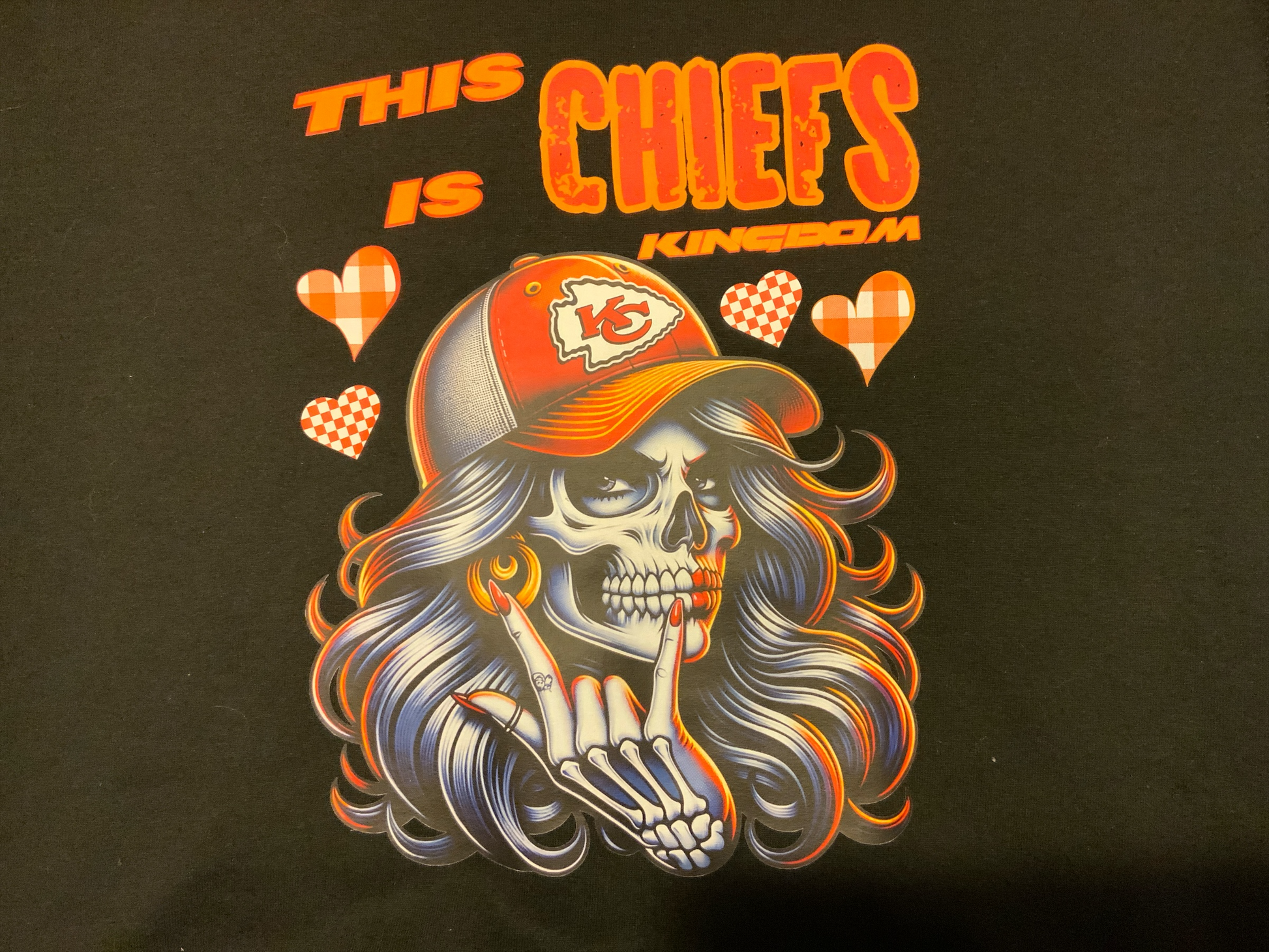 “This Is Chiefs Kingdom” skull girl graphic with plaid hearts
