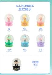 Each snowglobe features an adorable collectible character encased in a crystal ball filled with shimmering particles that swirl with energy when shaken. Tap the base and watch as the globe lights up, radiating a soothing glow that brings your favorite Pop Mart art toy to life.