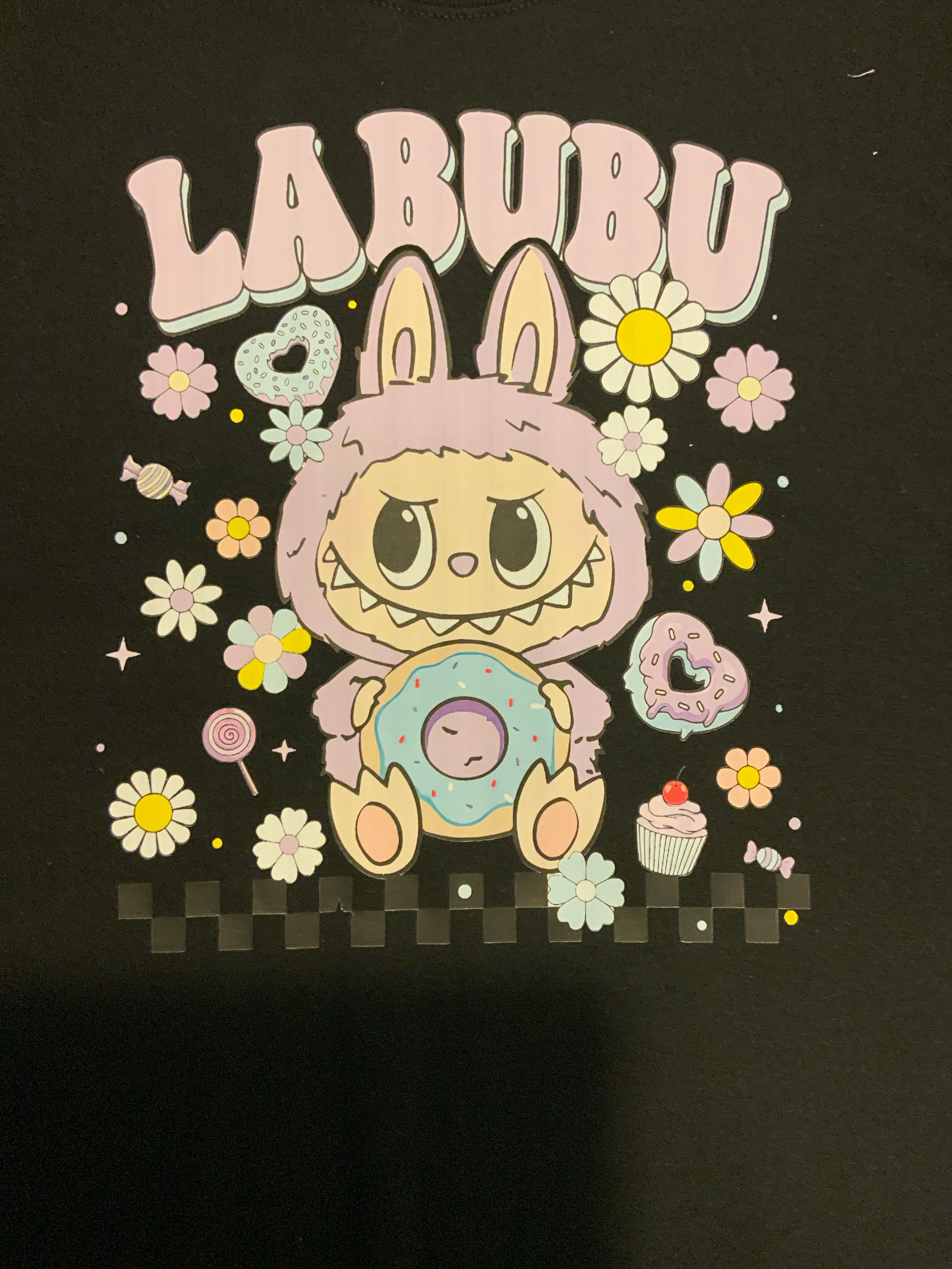 Show off your love for Labubu with this Handmade Labubu Short Sleeve Shirt, featuring the adorable and mischievous Labubu character in a soft pastel design surrounded by candy, cupcakes, and cheerful flowers.