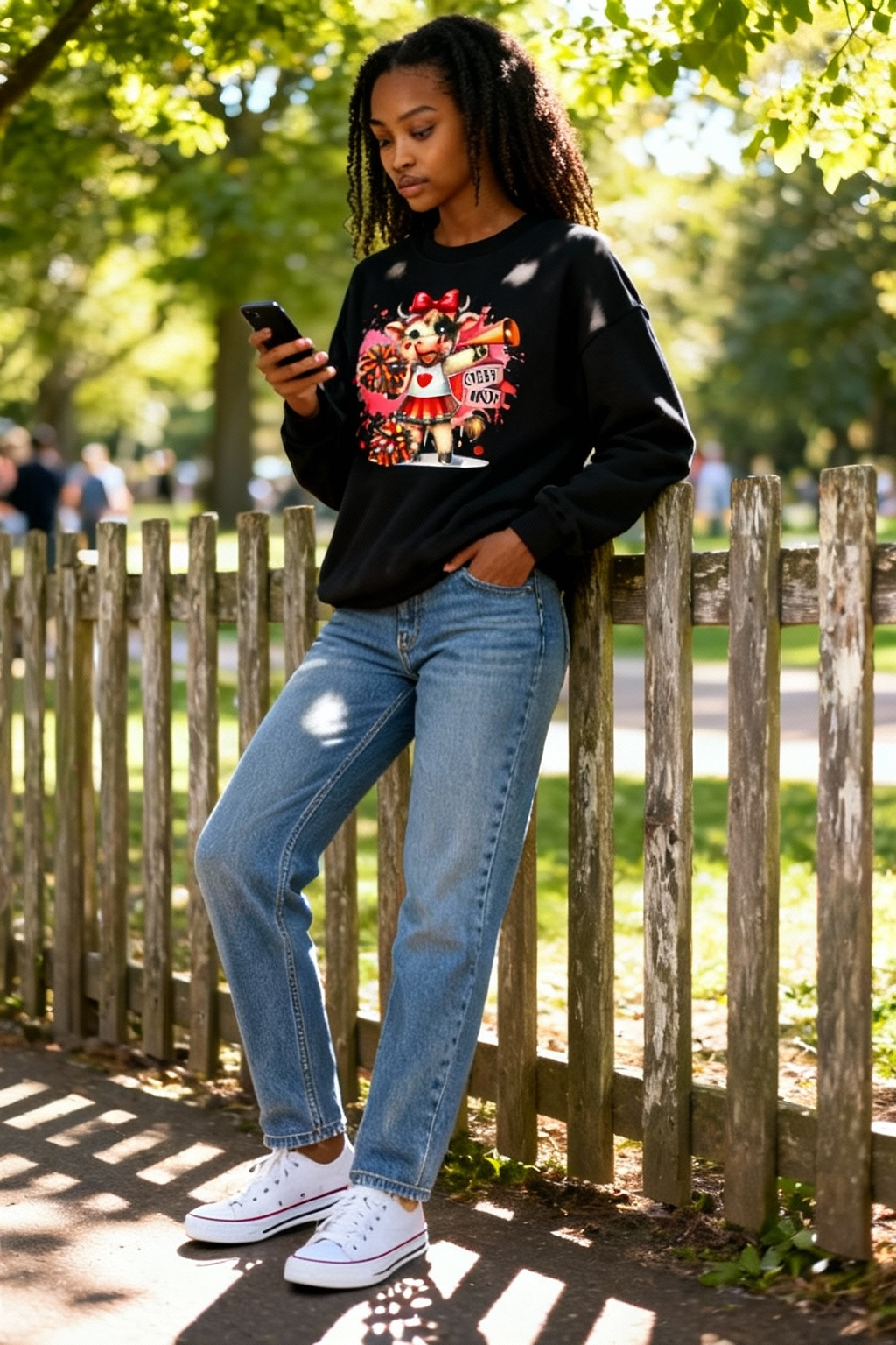 Cheer Mom Cow Sweatshirt – Cute Cheerleader Cow Graphic Crewneck – Funny Animal Spirit Wear, Game Day Outfit & Cheer Mom Gift